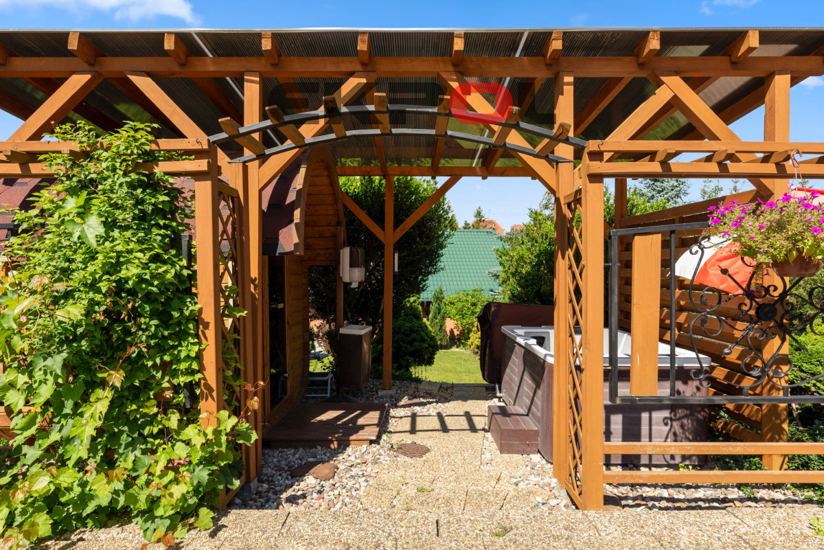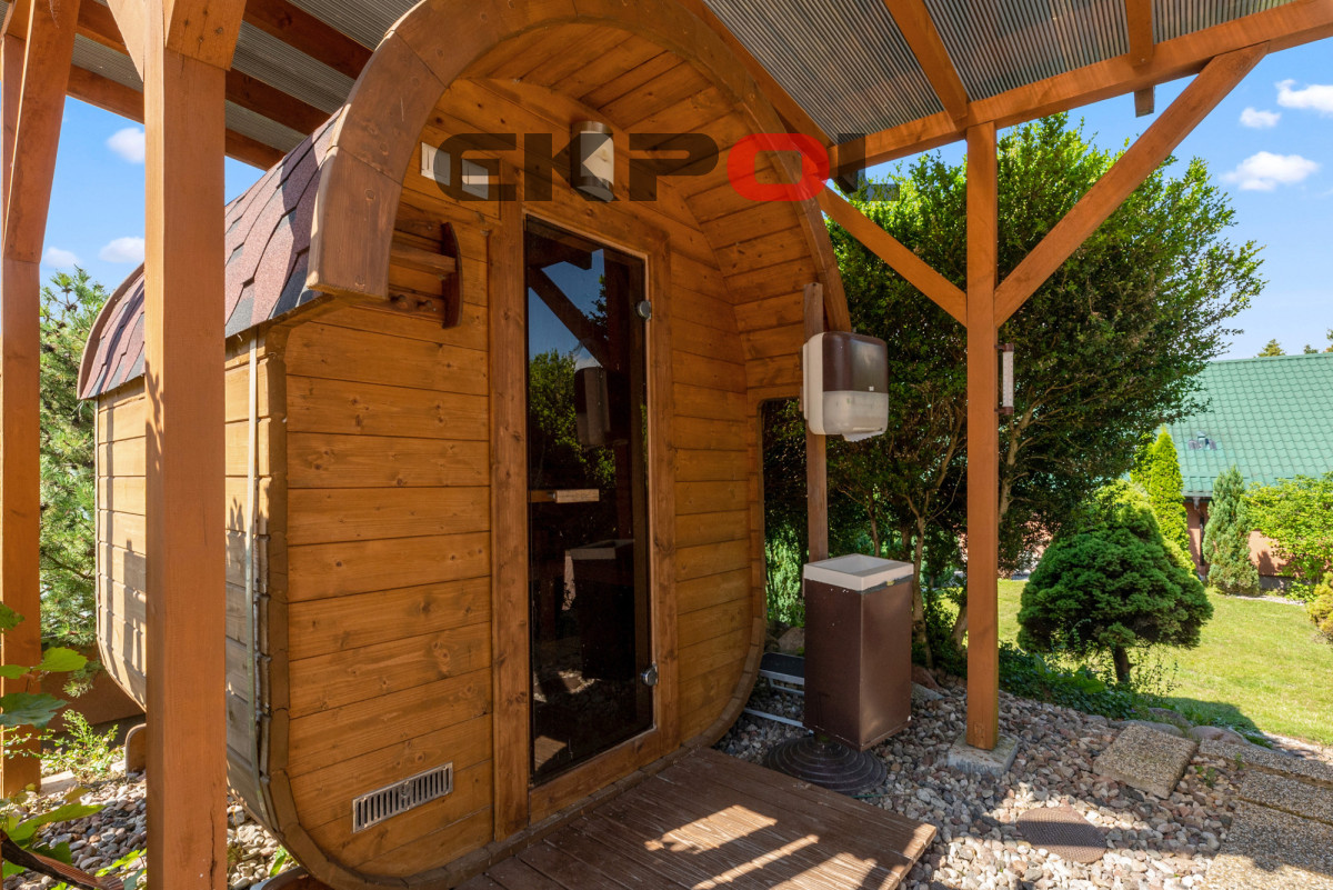 Budynek bardzo solidnie zbudowany, ocieplony styropianem. Ogród pięknie zaaranżowany, dający poczucie intymności, z atrakcją w postaci sauny oraz jacuzzi.